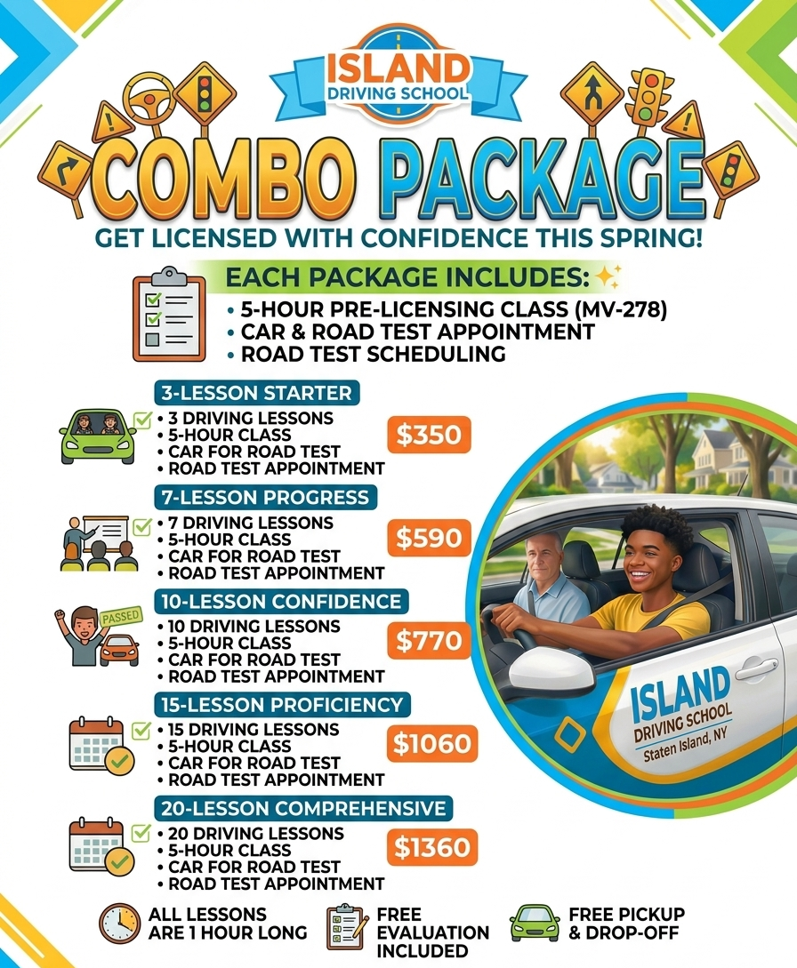 At Island Driving School, you will be taught by extremely qualified male and female Licensed & N.Y.S. Certified Instructors with many years of experience with patience and encouragement first-time drivers need to succeed, Our private lessons are with you and the instructor ONLY we will never have another student picked up while you are on your lesson unless it is for a road test, Our friendly office staff is eager to help and will always handle your concerns cordially and efficiently without pushing you into packages or services you are not looking to purchase. With our many years of service, you can be sure you'll have a pleasant experience from your first phone call to you receiving your Driver's License.